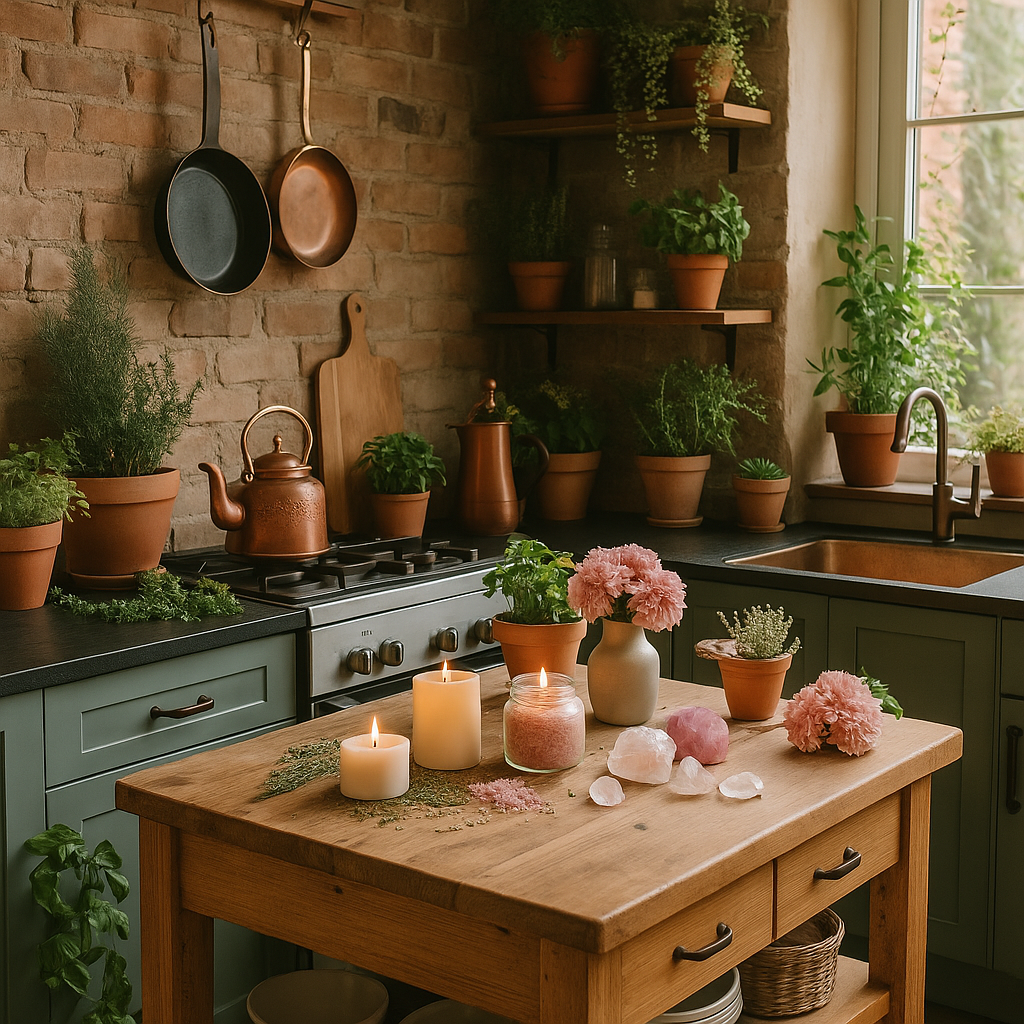 Une table en bois, une lumière douce qui glisse sur les murs en briques, quelques herbes fraîches qui sèchent lentement… et moi, penchée sur un carnet, laissant naître les mots qui deviendront vos offrandes, vos douceurs, vos instants de présence.